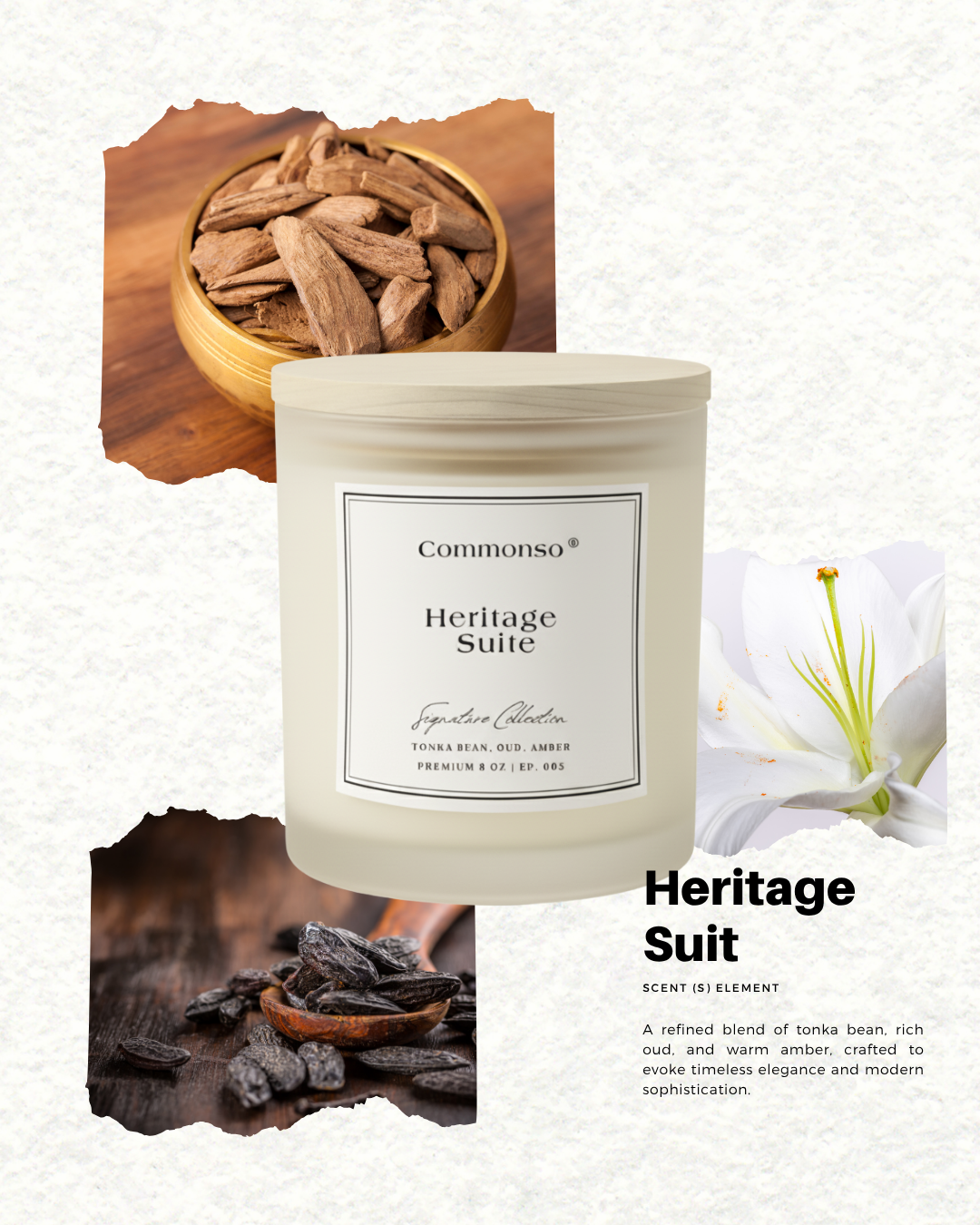 Elevate your space with Heritage Suite, a hand-poured candle that captures timeless sophistication. Crafted with a rich blend of tonka bean, smoky oud, and warm amber, this scent unfolds in layers—smooth, resinous, and deeply comforting.